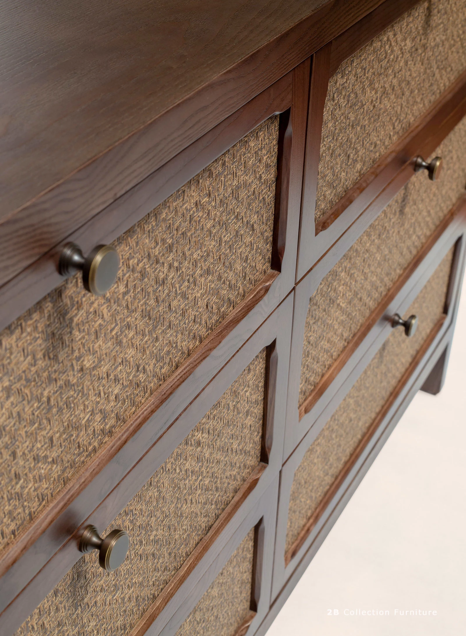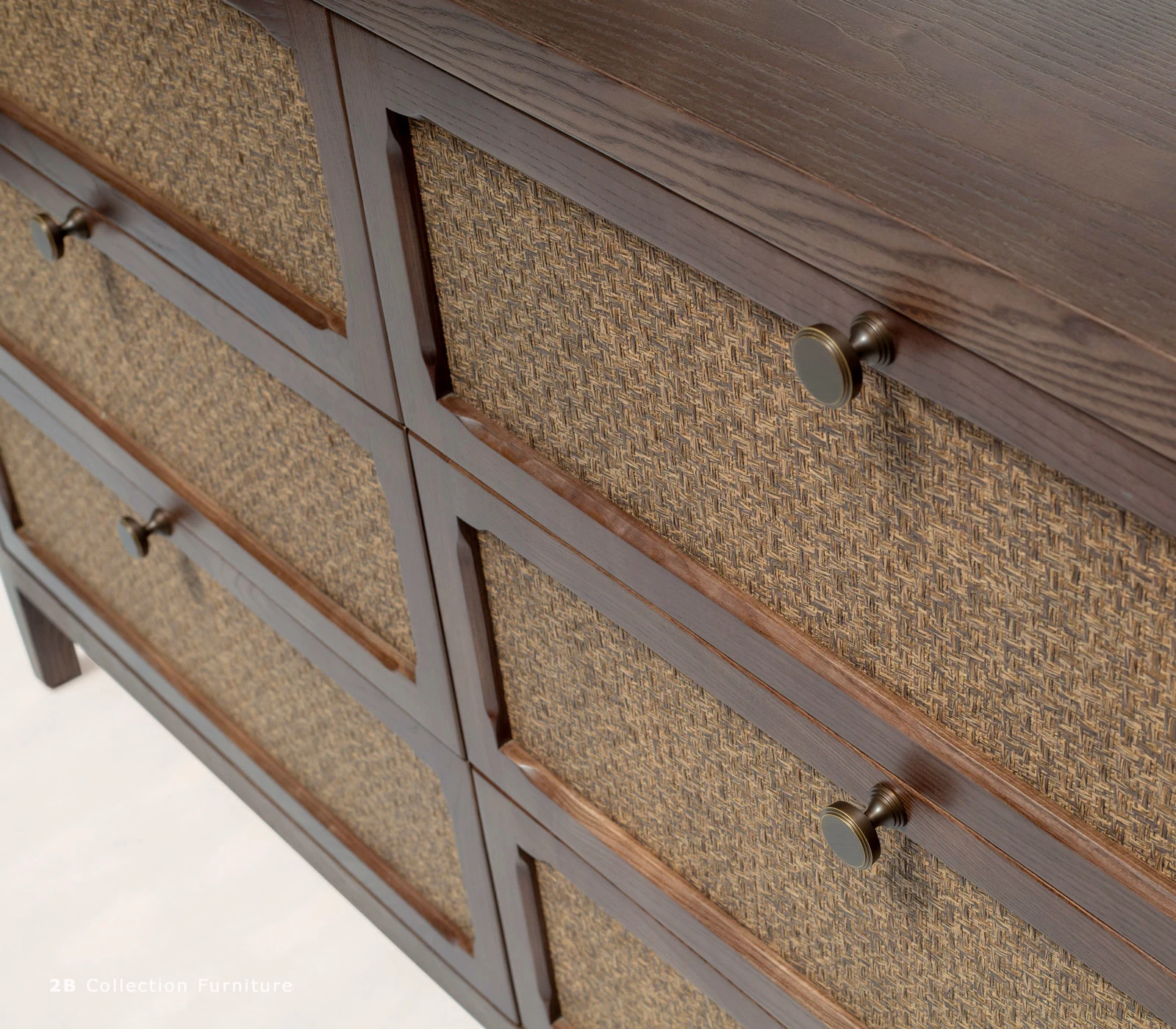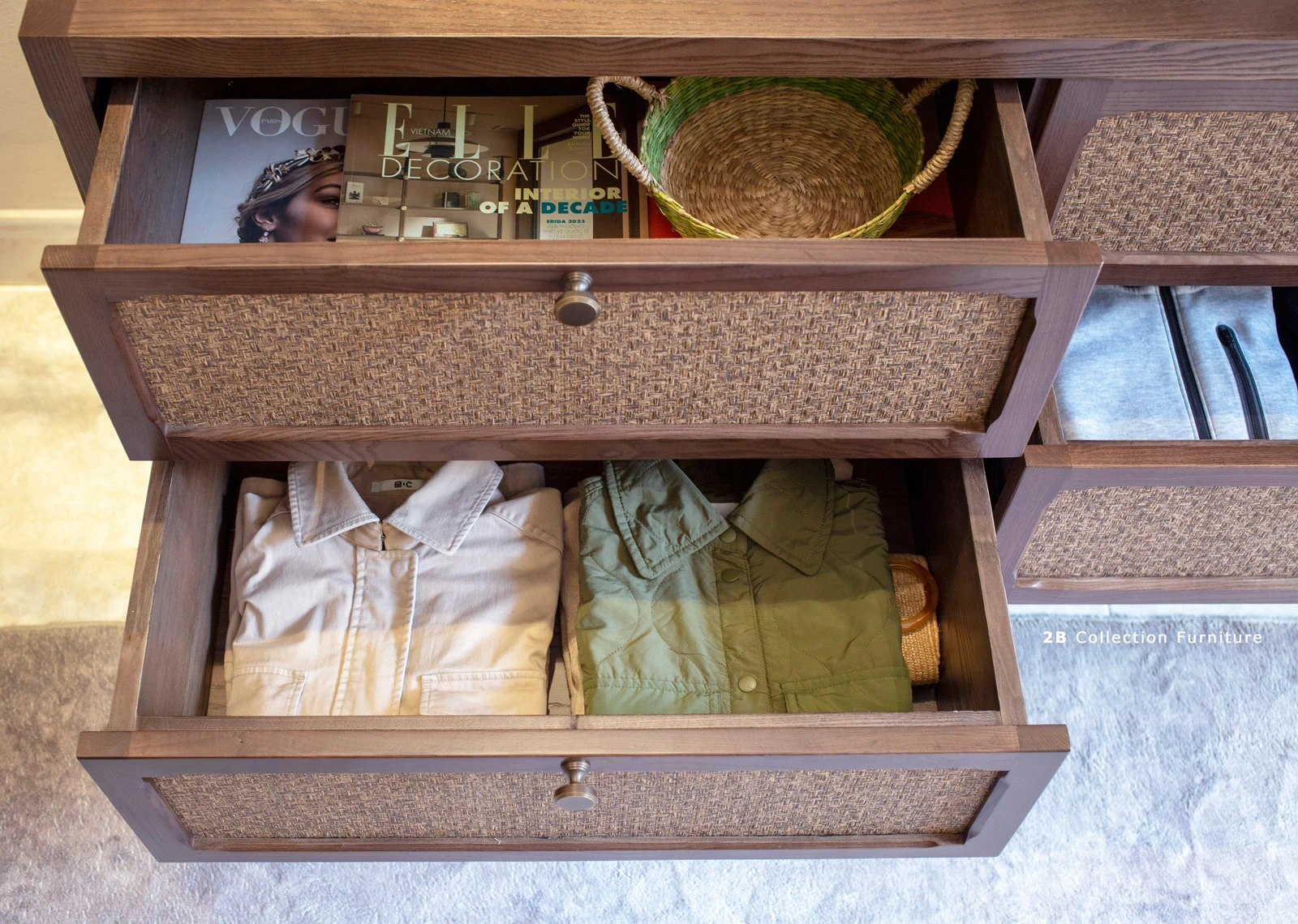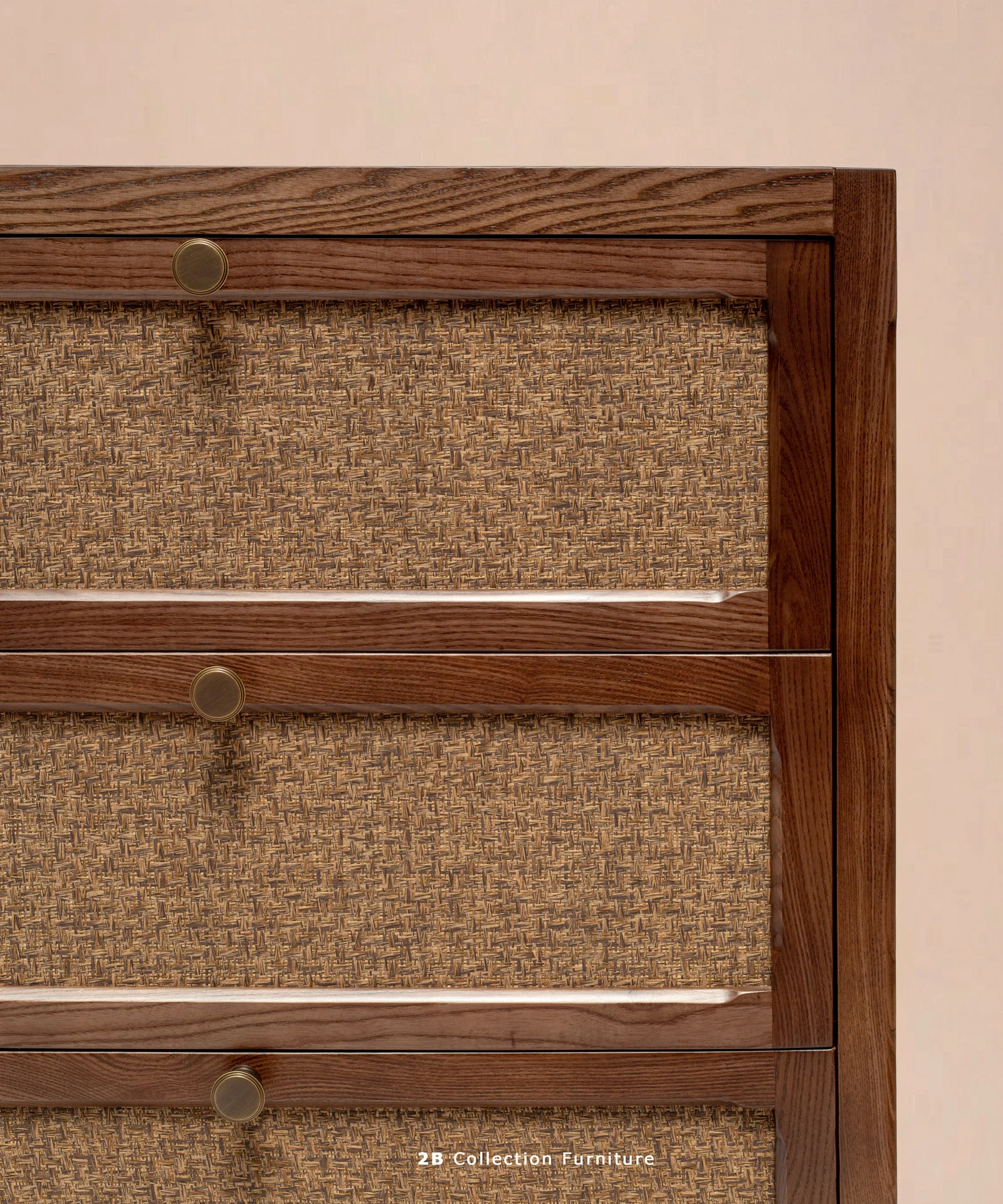 Sự kết hợp hài hòa giữa chất liệu gỗ tự nhiên ấm áp và mặt ngăn kéo được ốp tấm grass cloth (sợi đan) mang đến nét mộc mạc, tạo điểm nhấn thị giác vừa bình yên, vừa sang trọng cho không gian sống của bạn.