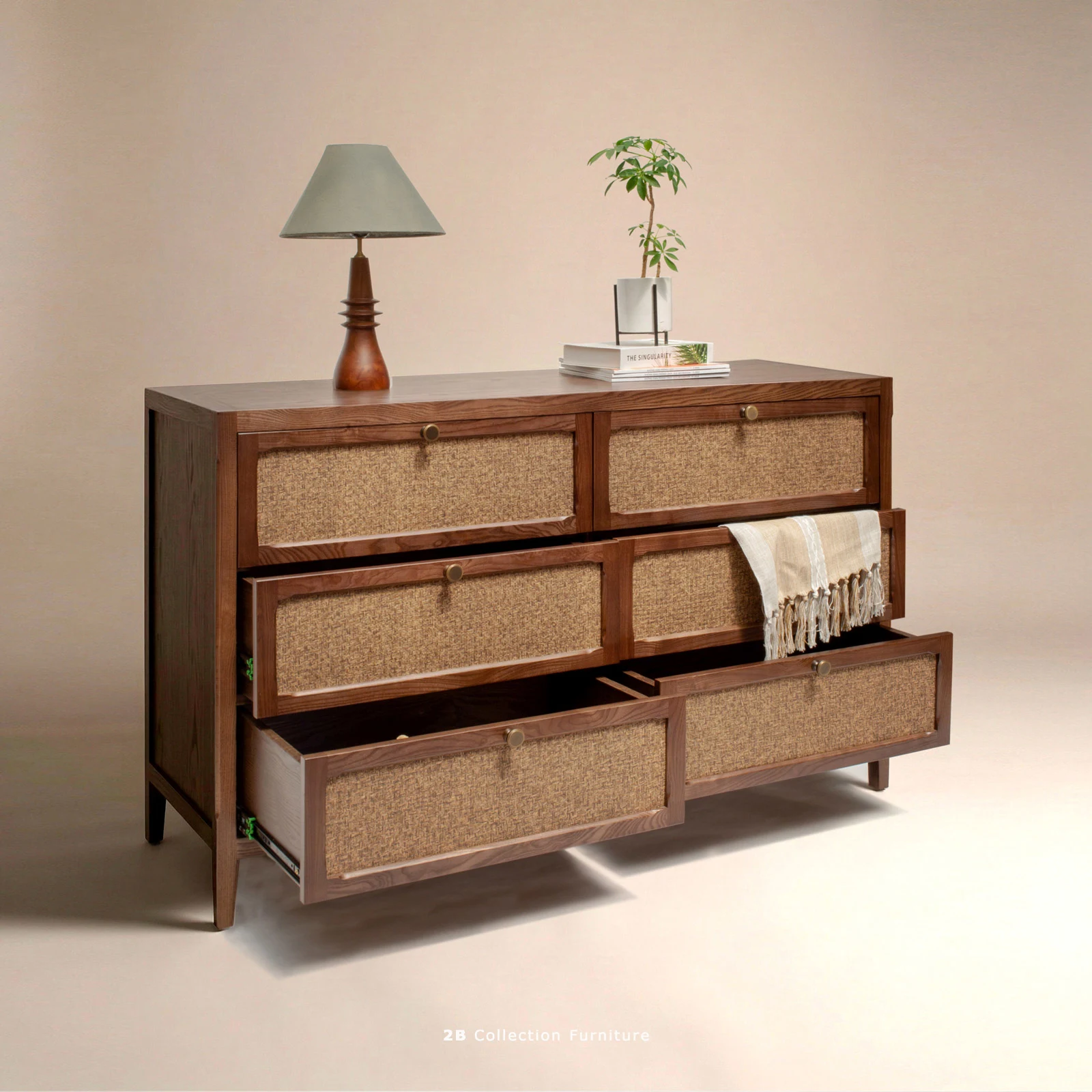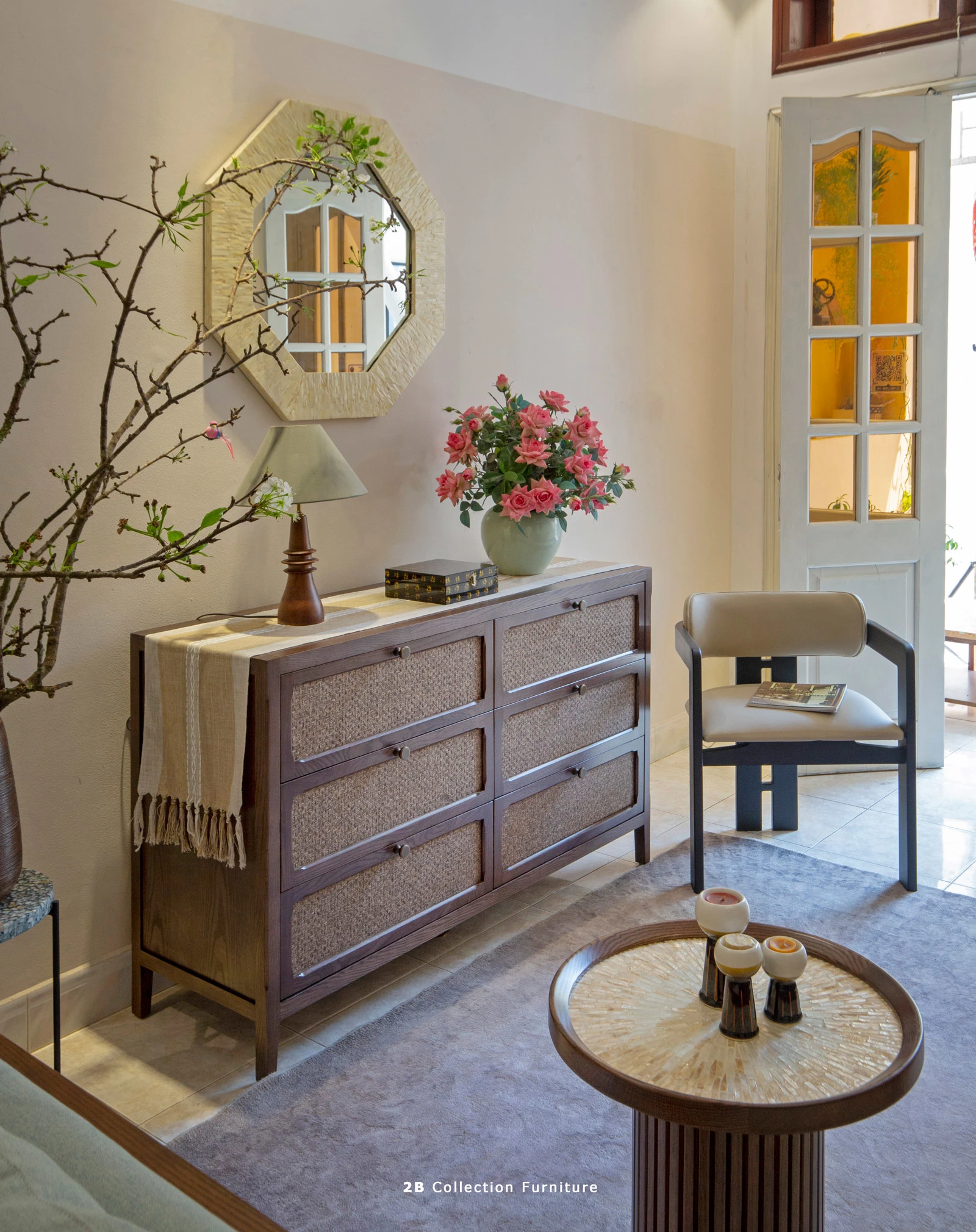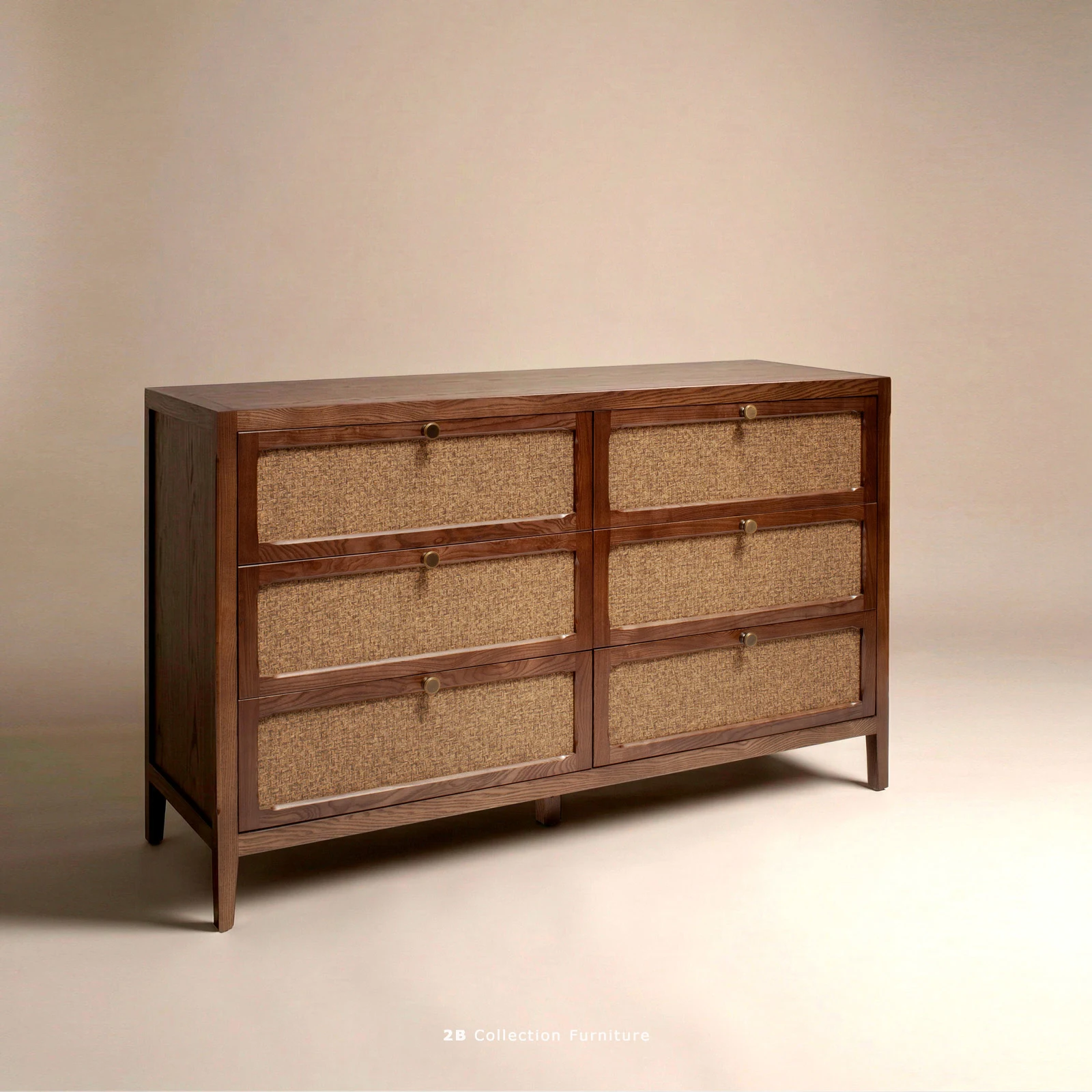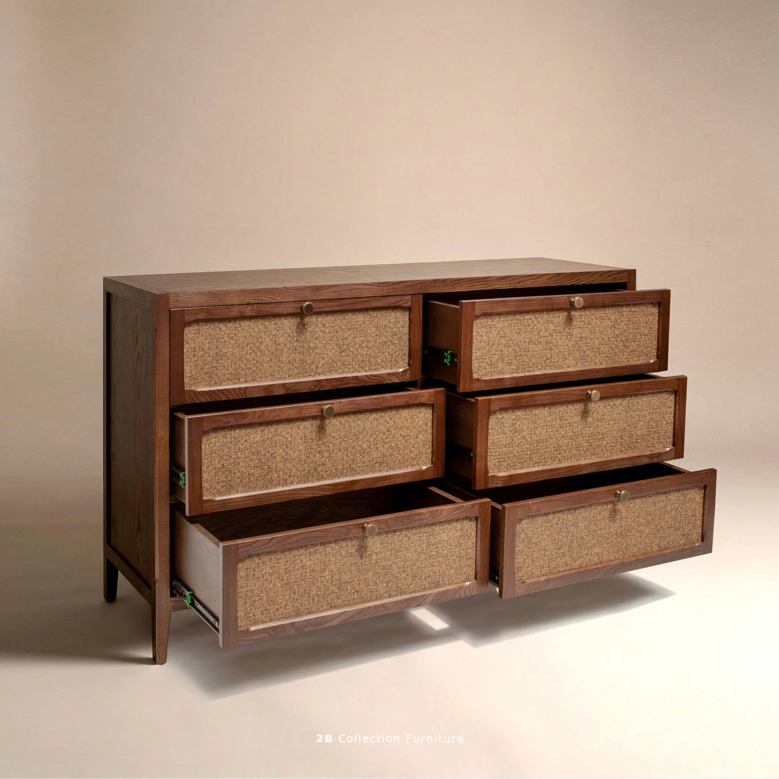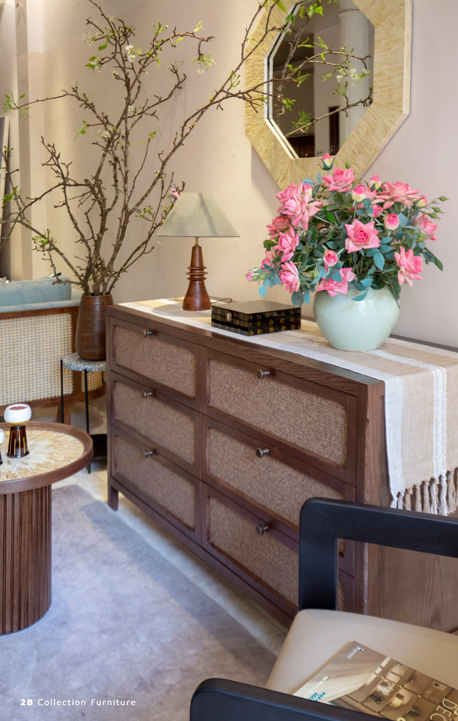 Sự kết hợp hài hòa giữa chất liệu gỗ tự nhiên ấm áp và mặt ngăn kéo được ốp tấm grass cloth (sợi đan) mang đến nét mộc mạc, tạo điểm nhấn thị giác vừa bình yên, vừa sang trọng cho không gian sống của bạn.